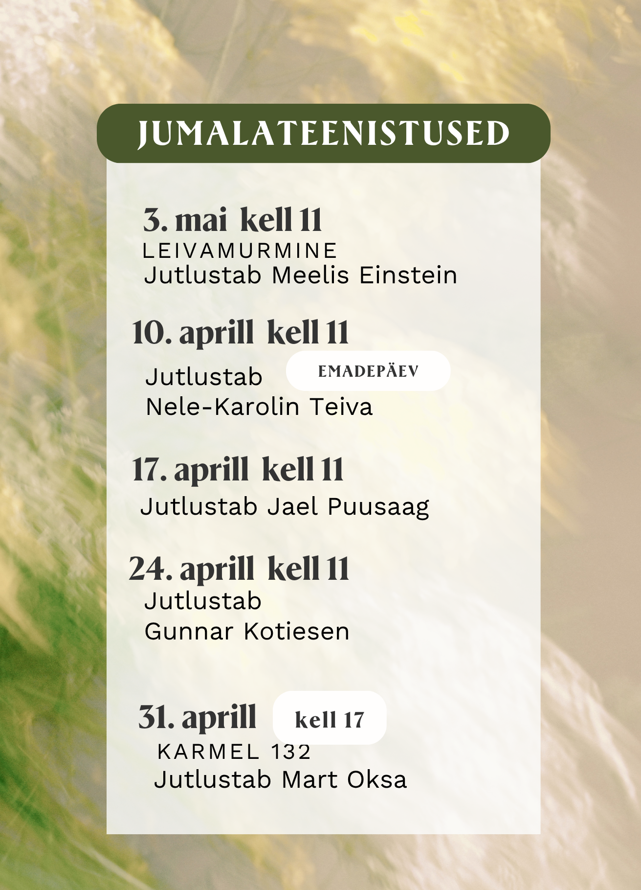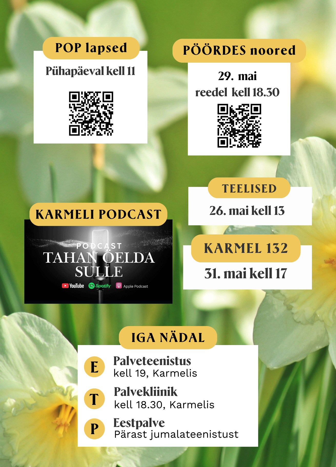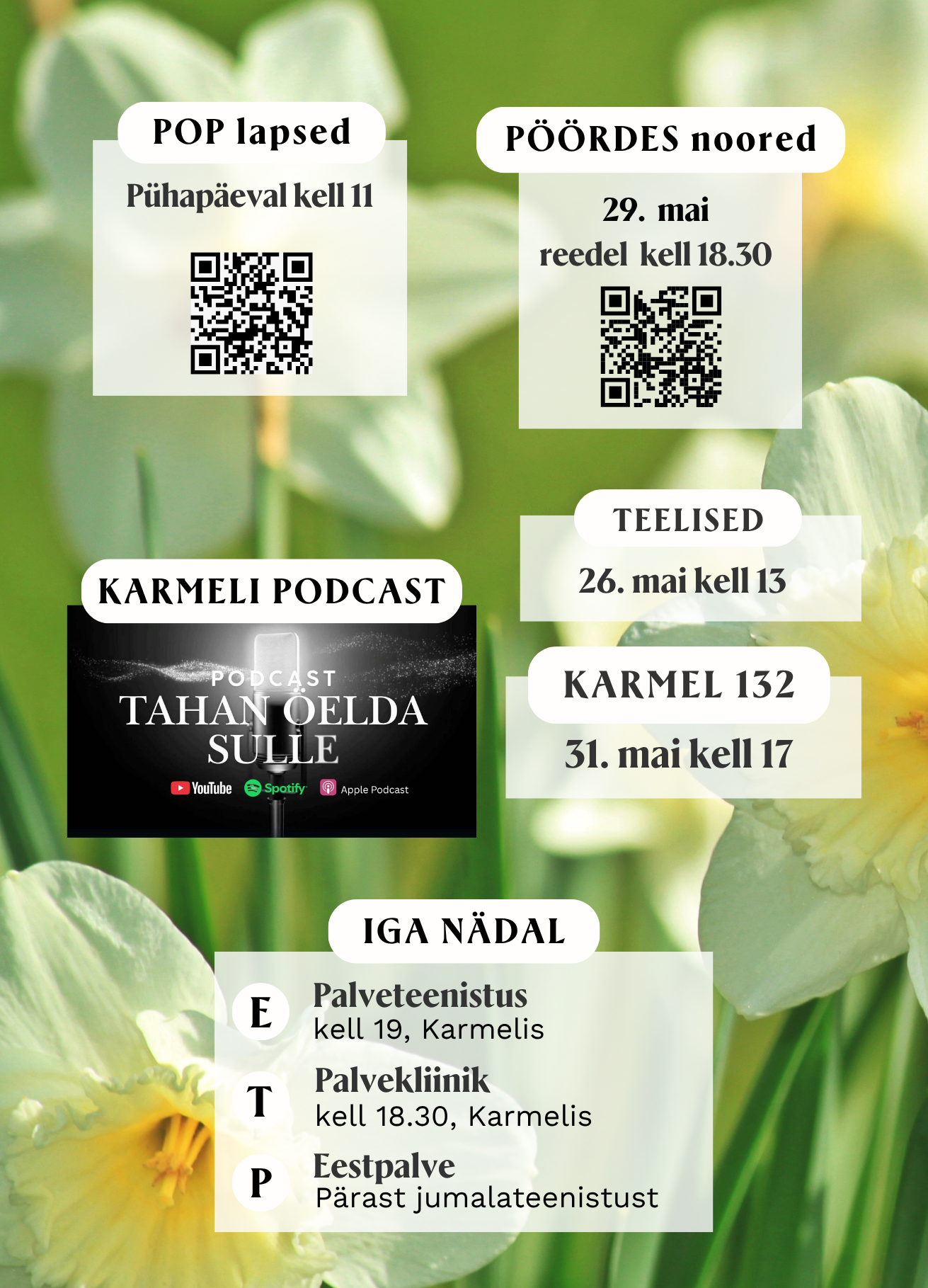 Tere tulemast Karmeli! SEE KUU Karmelis Teenistused pühapäeviti kell 11 POP Jõulurännak alfa kursus 2025 podcast 'tahan öelda sulle' Ehitame valmis! Vaata teenistusi Facebook Youtube APRILL KARMELIS Jumalateenistused Jumalateenistused teenistused PALVE & PAAST PALVE & PAAST Piibel Erinevad tegevused Erinevad tegevused tule OSALE