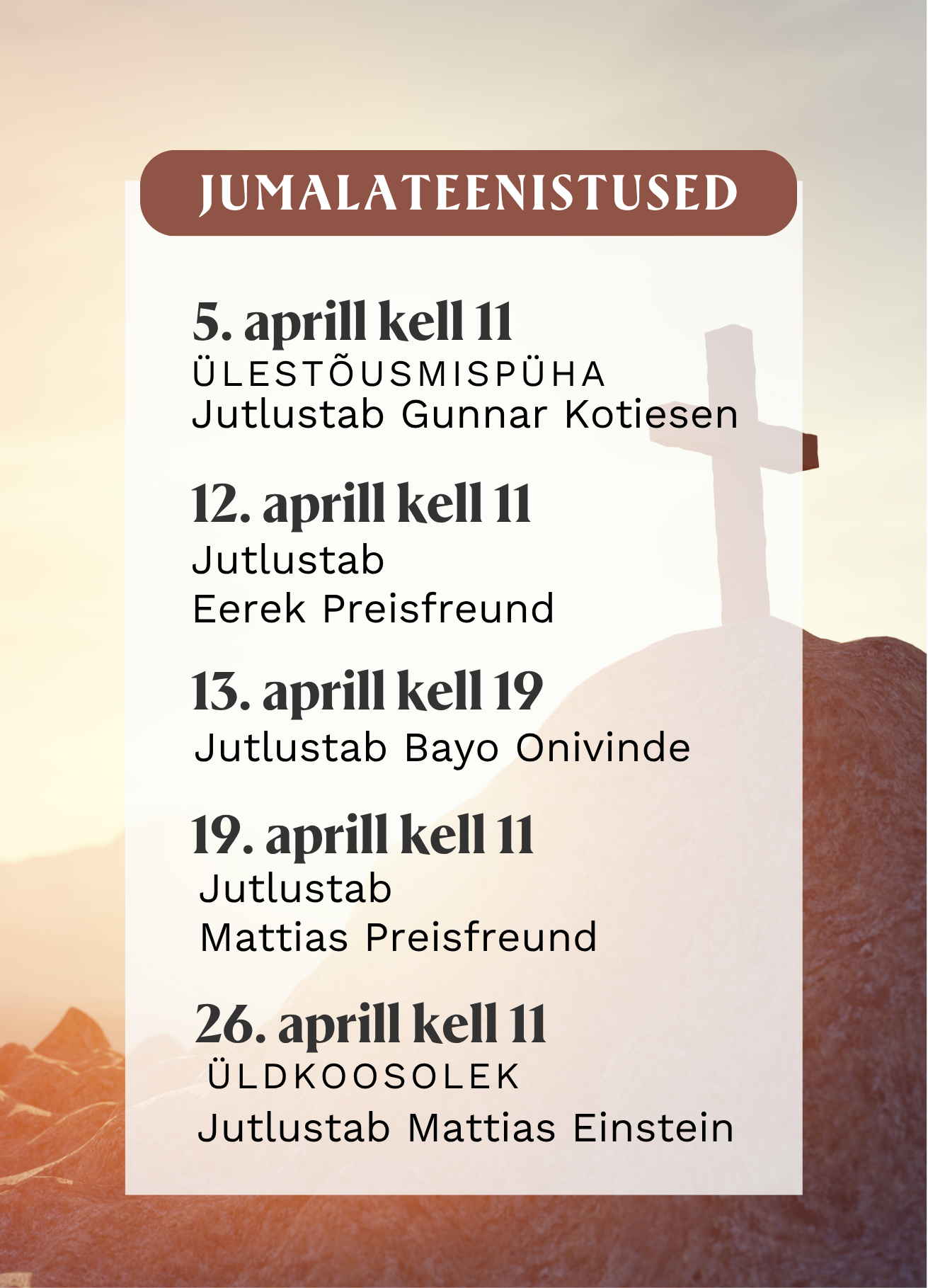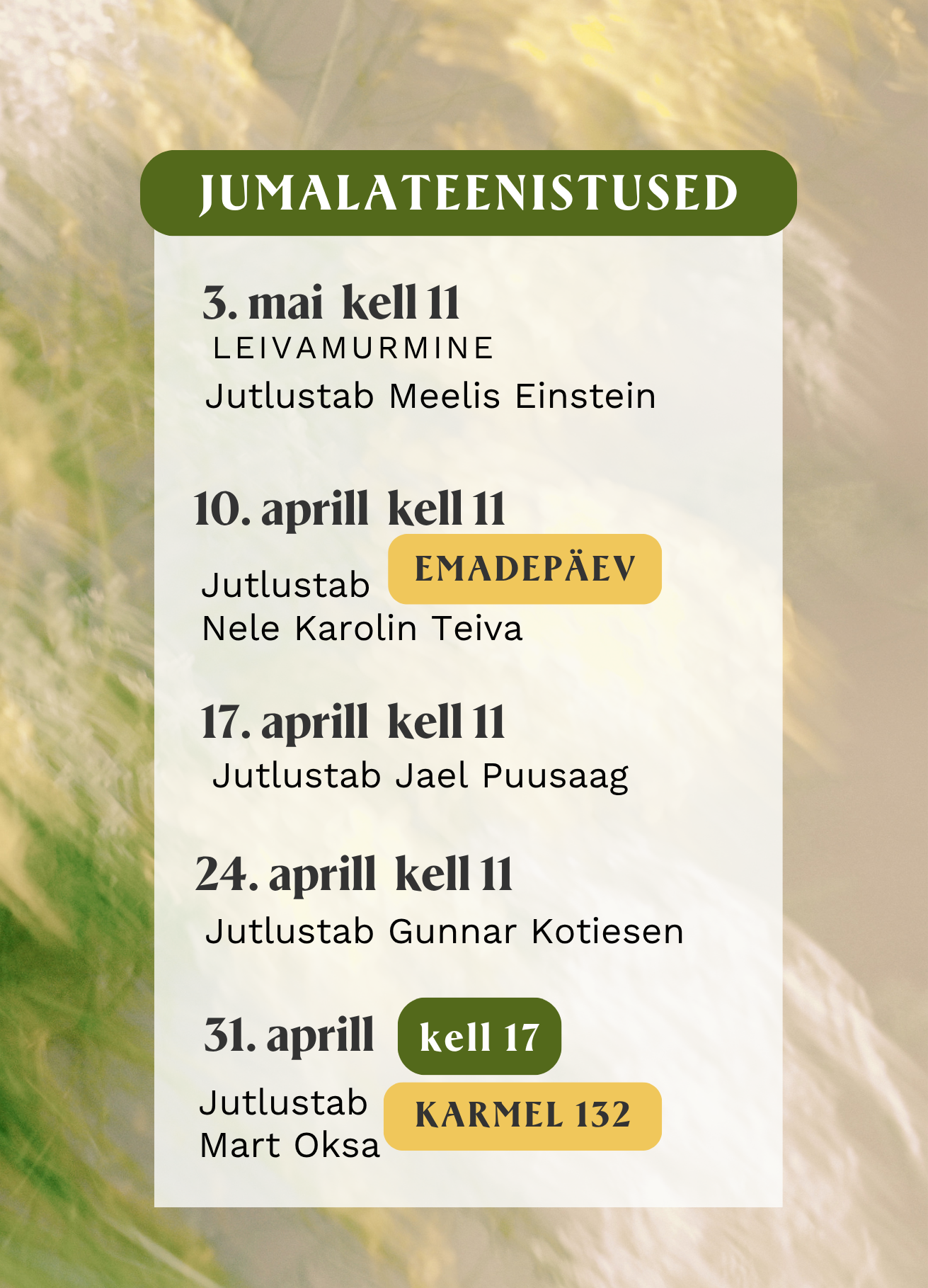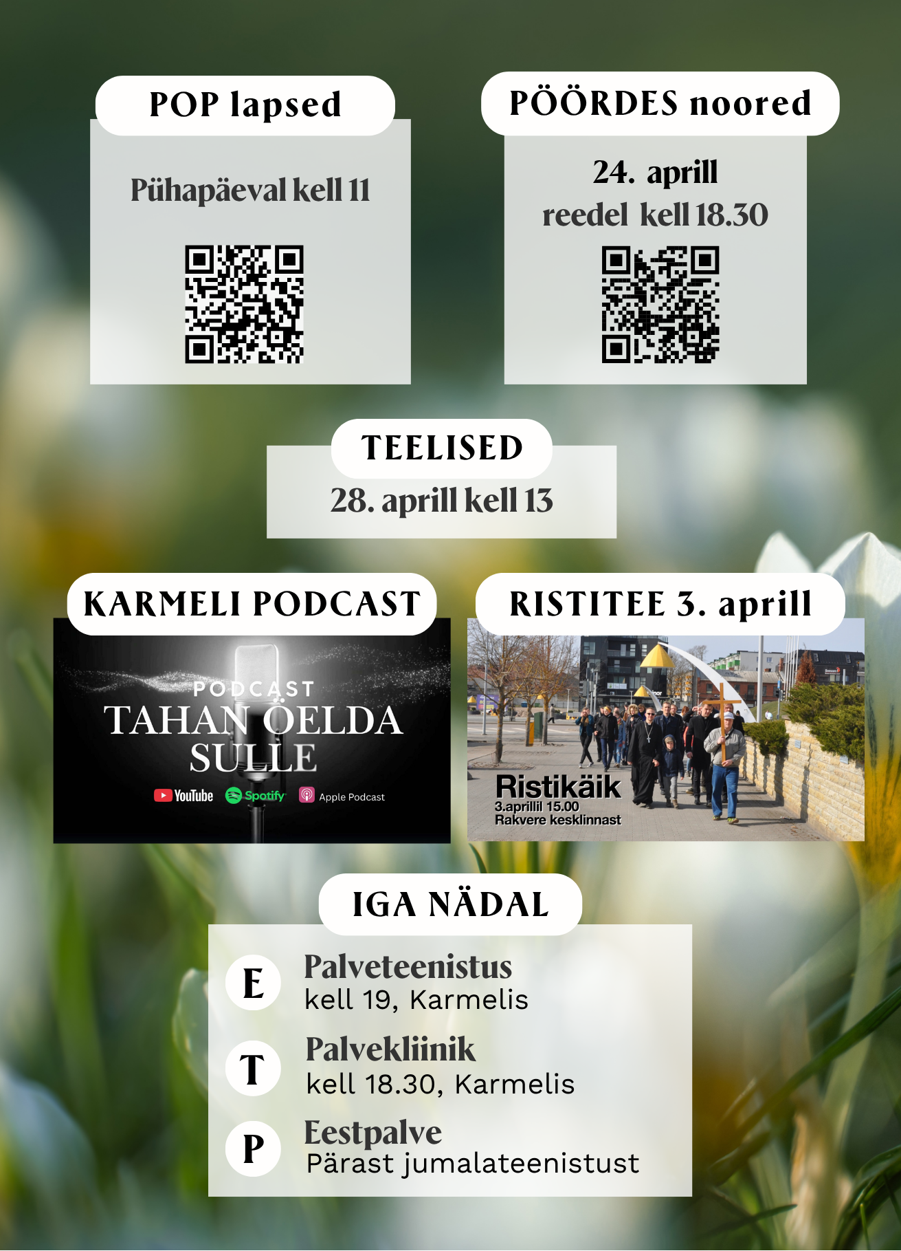 Tere tulemast Karmeli! SEE KUU Karmelis Teenistused pühapäeviti kell 11 POP Jõulurännak alfa kursus 2025 podcast 'tahan öelda sulle' Ehitame valmis! Vaata teenistusi Facebook Youtube APRILL KARMELIS Jumalateenistused Jumalateenistused teenistused PALVE & PAAST PALVE & PAAST Piibel Erinevad tegevused Erinevad tegevused tule OSALE